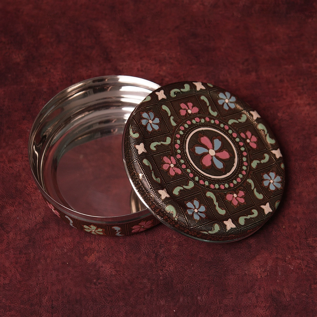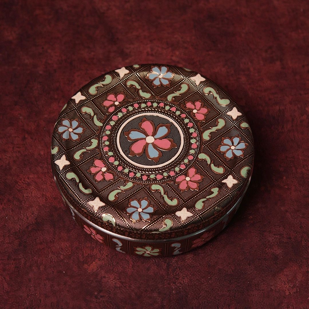 The Floral Minakari Box from Kottanz is our most expressive enamel box — a large, generously proportioned piece that turns the age-old Minakari tradition into a full floral celebration. Blooms in pastel pink, sky blue, and mint green sprawl across a warm metallic base, bordered by fine engraved detailing that gives this box the look and feel of a family heirloom from the very first moment you hold it.