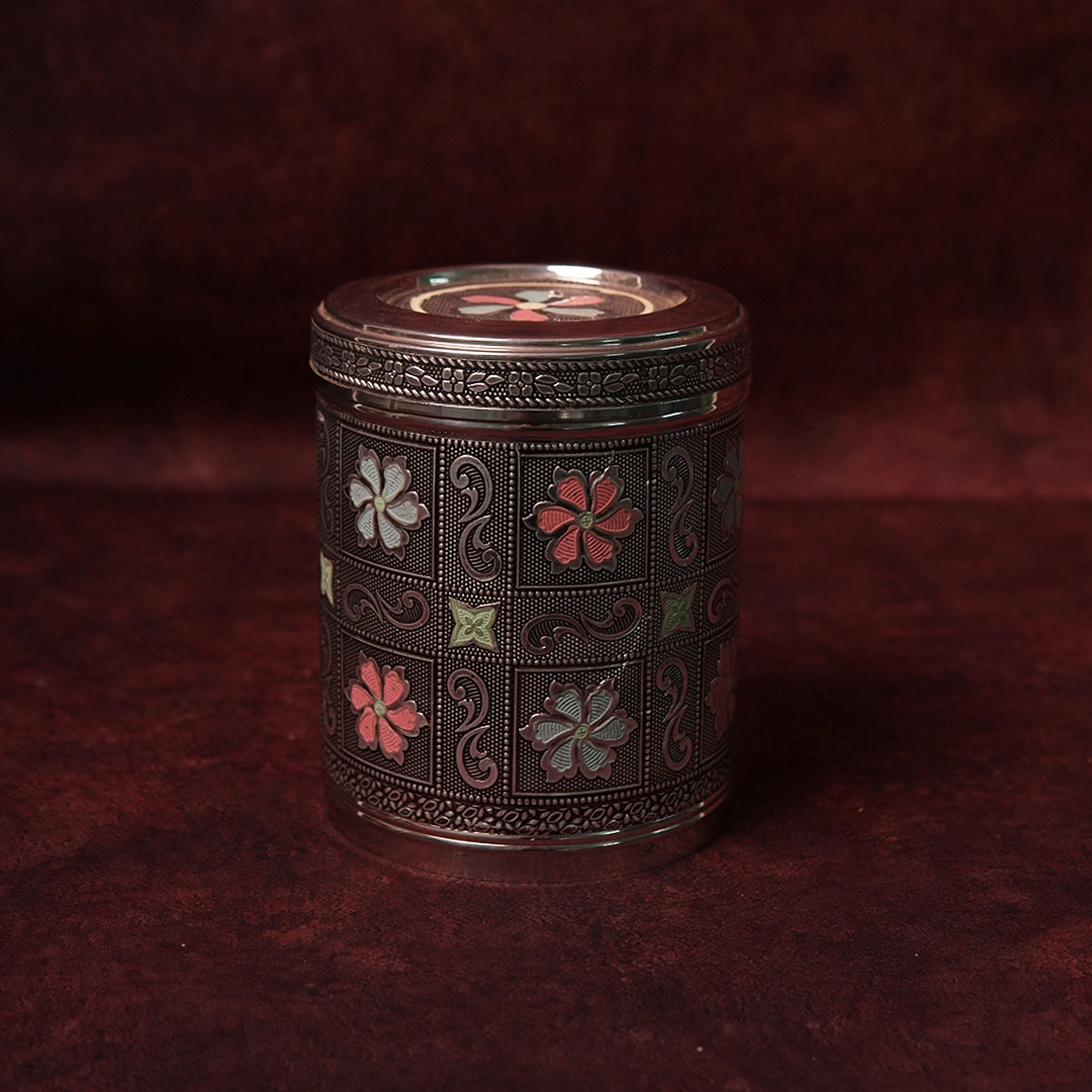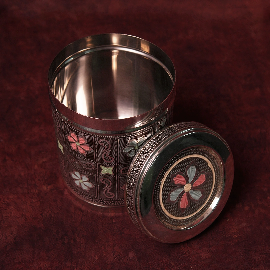 The Floral Minakari Jar from Kottanz is a generously proportioned enamel jar — wider and taller than the box range — that serves equally as a functional storage piece and a stunning display item. Covered entirely in hand-painted Minakari florals on a rich metallic body with a snug fitted lid, this jar is made to be seen, used, gifted, and treasured. Whether it holds spices, dry fruits, sacred items, or sits beautifully empty on a shelf — it earns its place in every Indian home.