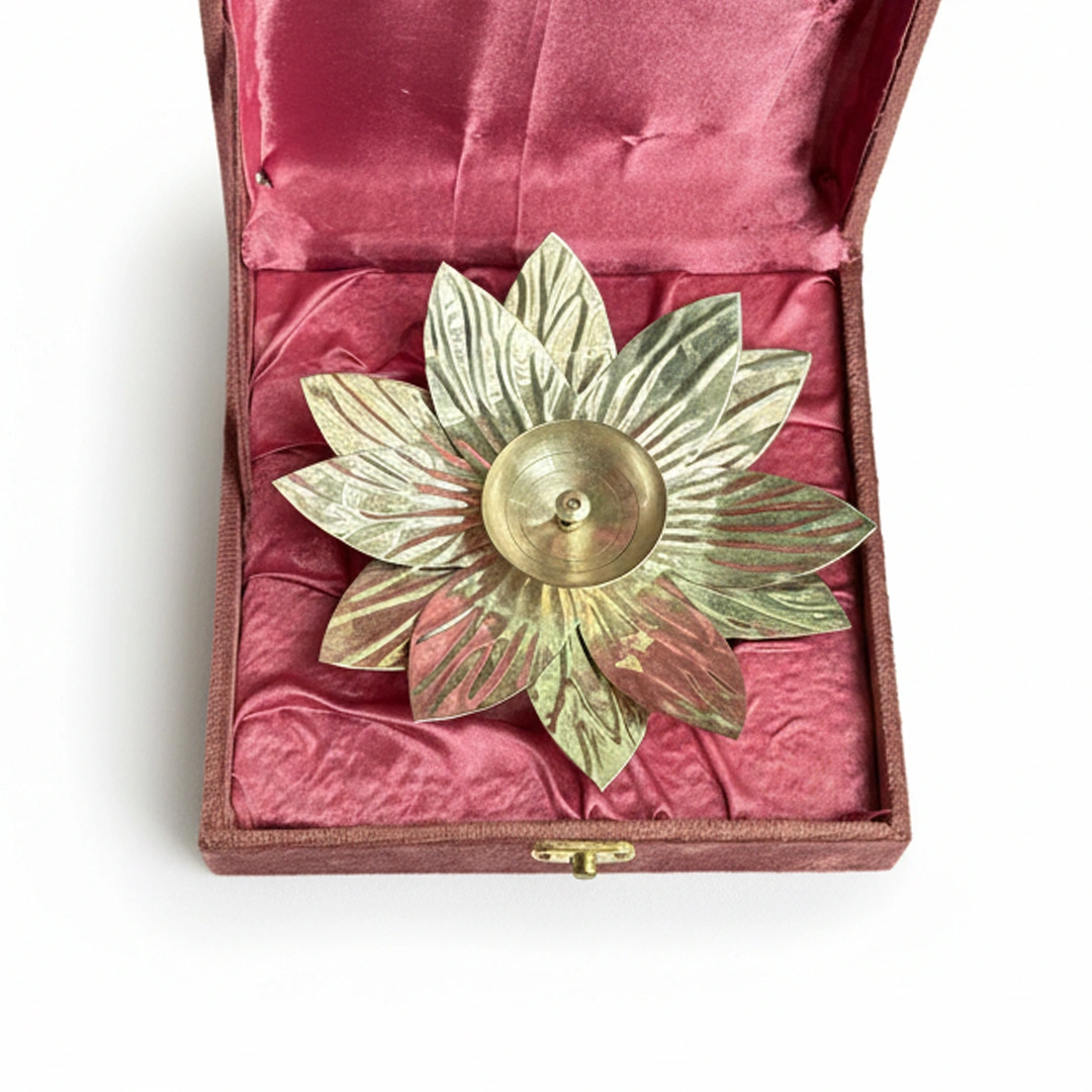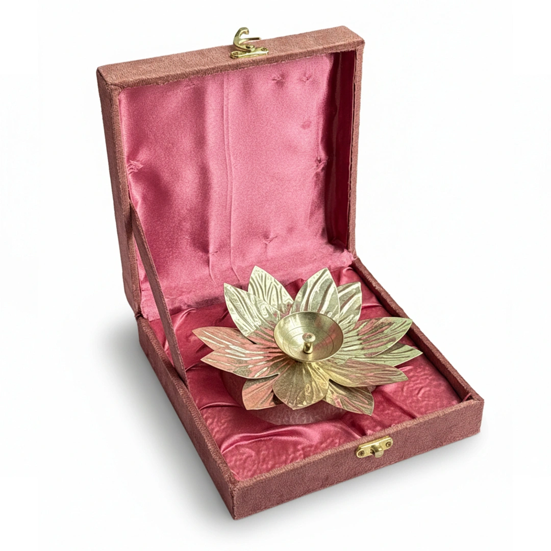 Exquisite handcrafted brass lotus diya with intricate petal design, beautifully presented in a luxurious velvet-lined gift box for auspicious occasions.
