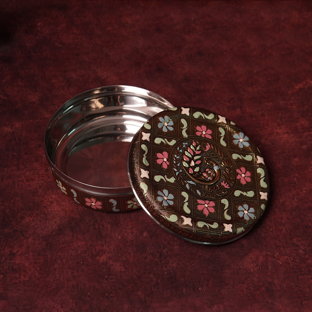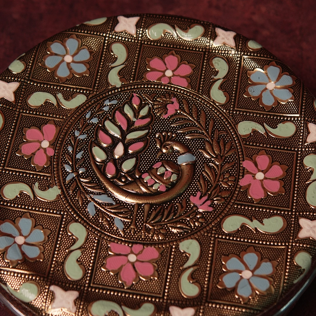 The peacock — India’s most beloved symbol of grace and abundance — dances across this handpainted Minakari box in vivid enamel glory. A gift as majestic and auspicious as the bird itself.